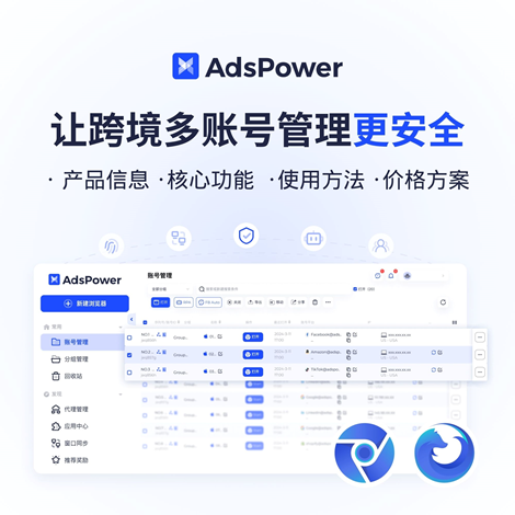AdsPower 是一款专注出海平台多账号安全管理的指纹浏览器。致力为联盟营销、广告投放、跨境电商、海外社媒等场景的账号矩阵提供隔离、干净、安全的浏览器环境,降低多账号运营风险,提高多账号管理效率。产品推出至今,经过多次的迭代,已服务 500W+ 用户,守护 2亿+ 个账号安全。