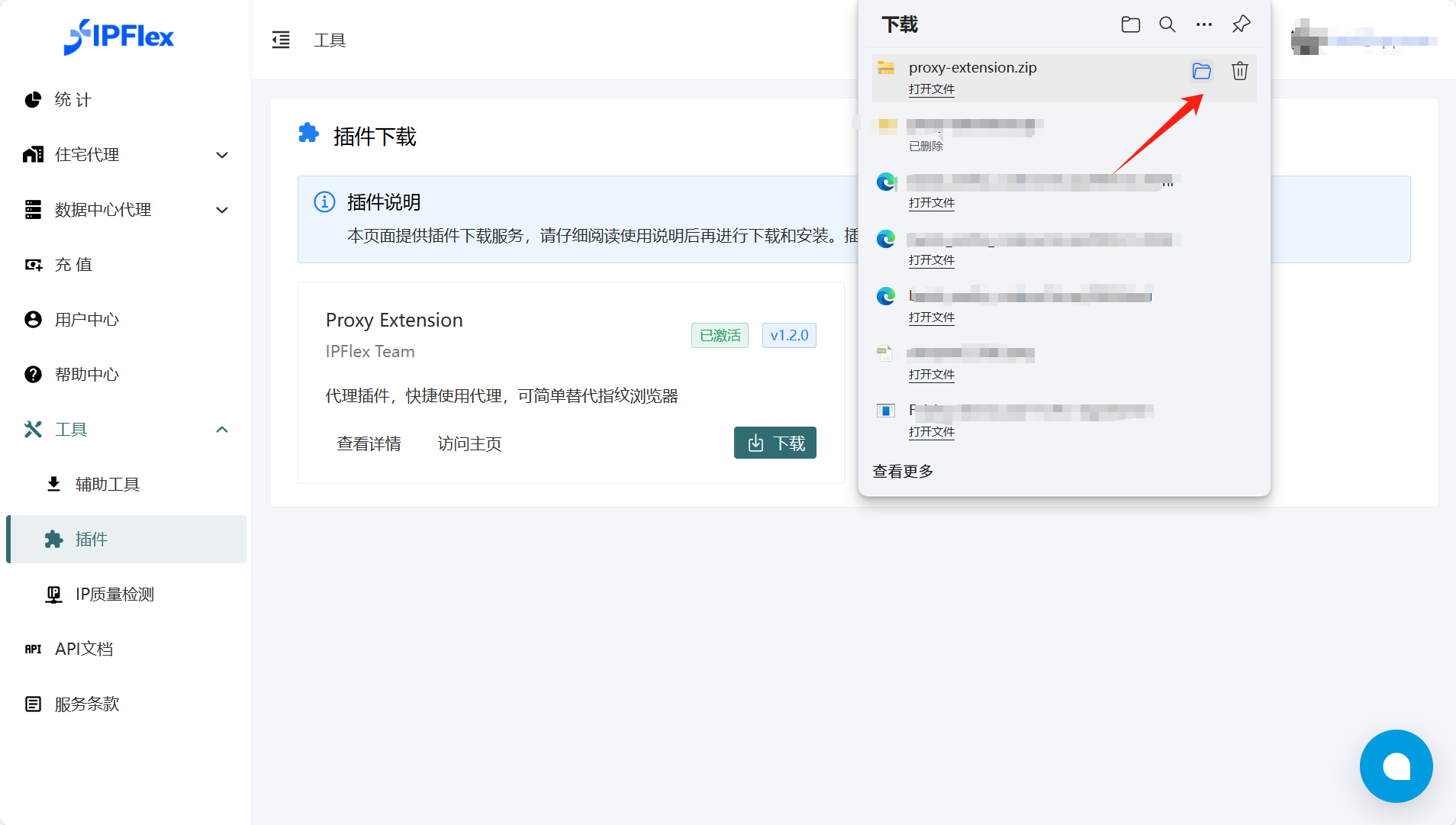 1、注册登录IPFlex后,选择工具-插件,点击下载Proxy Extension。(安装该代理插件能快捷配置、使用代理,可简单替代指纹浏览器,适用于Chrome、Microsoft Edge、火狐等浏览器)