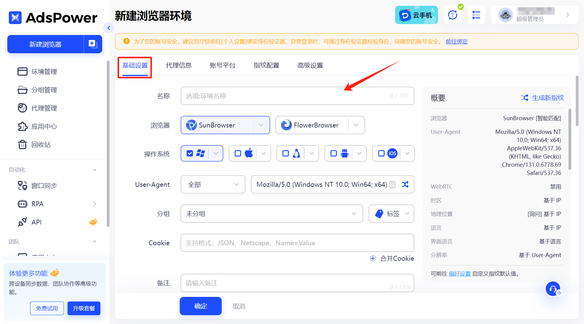 2、在基础设置中进行浏览器的基础设置,可按需选择以下内容,也可直接保持默认选项(Adspower已根据当前环境进行最佳配置设置)。