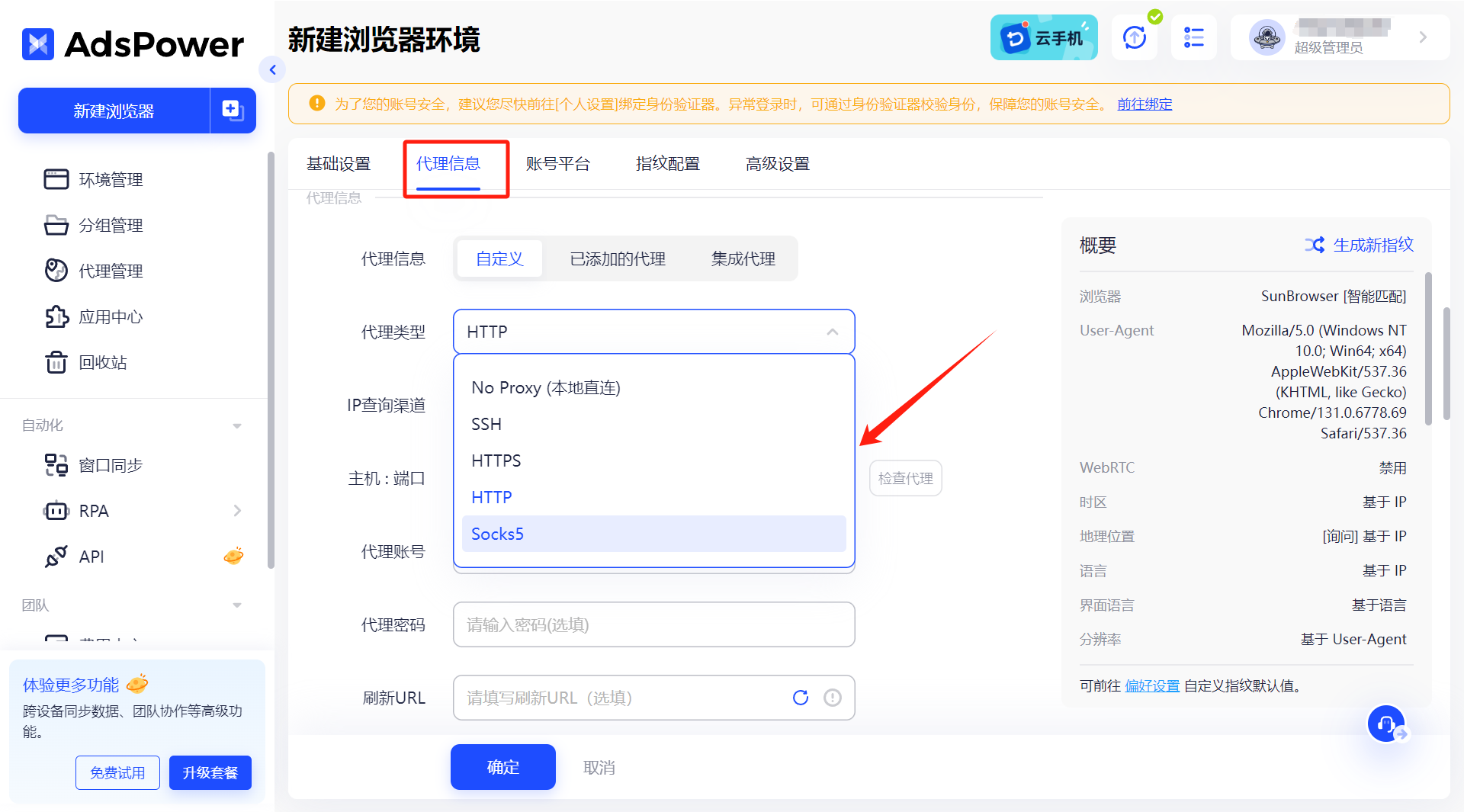 3、在代理信息中进行代理IP的设置,首先选择代理类型,根据所设置的代理IP类型选择即可(示例代理为HTTP代理)。