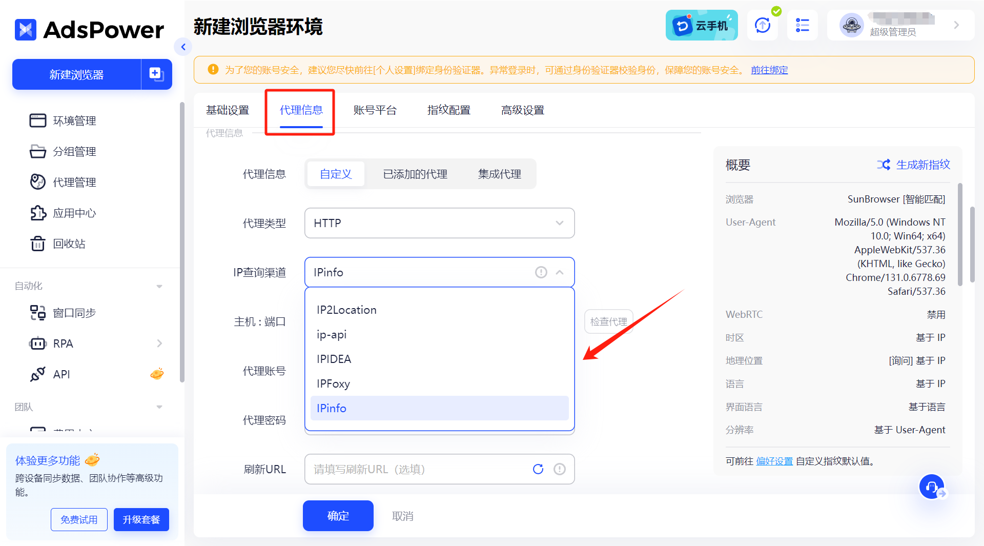 4、按需选择IP查询渠道(图示选择IPinfo作为IP查询渠道),IP查询渠道通常会查询IP是否正常以及IP状态是否健康等。