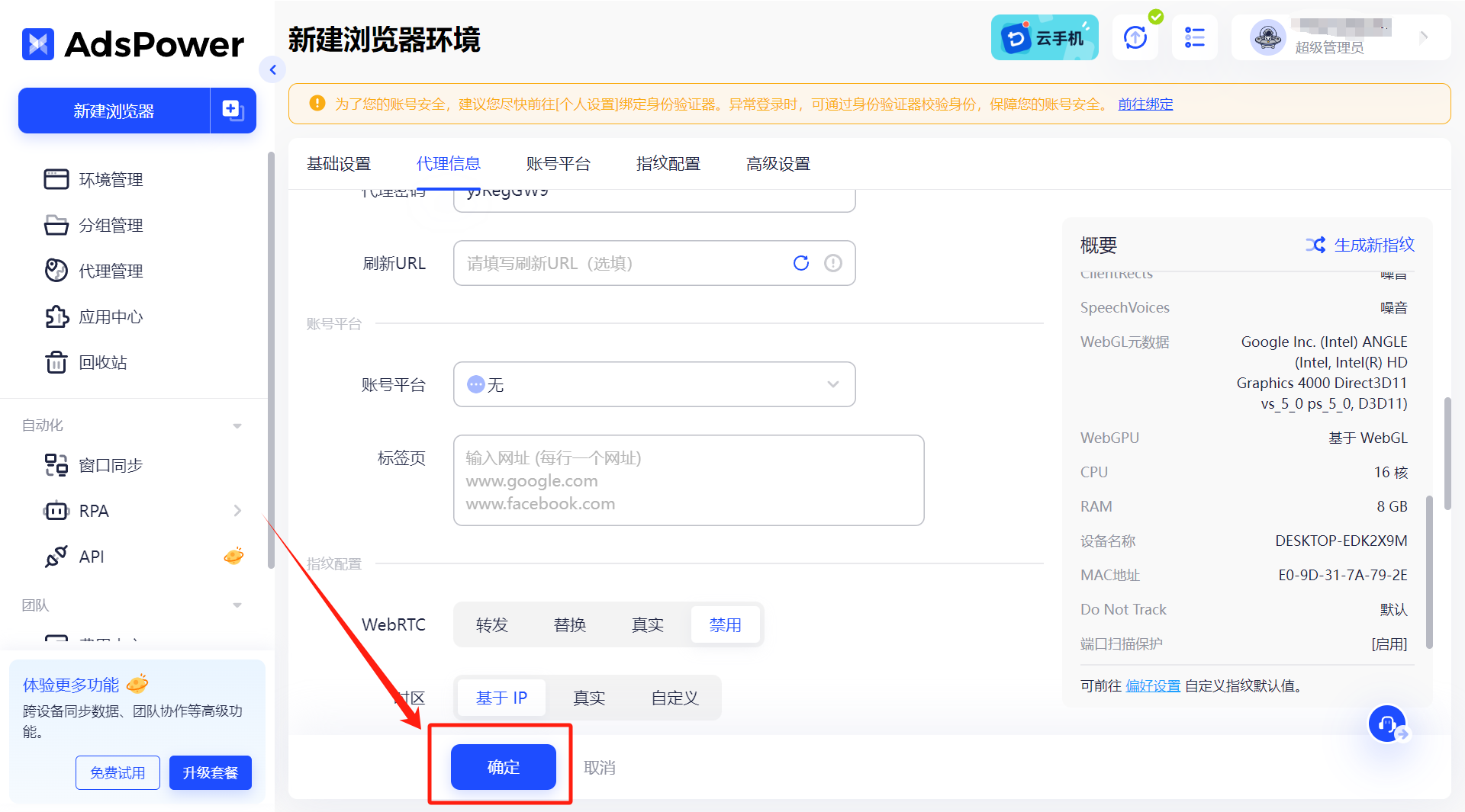 8、设置完以上信息即可点击确定保存设置,除代理信息外其他信息也可按需求选择设置(如账号平台、指纹配置等)。