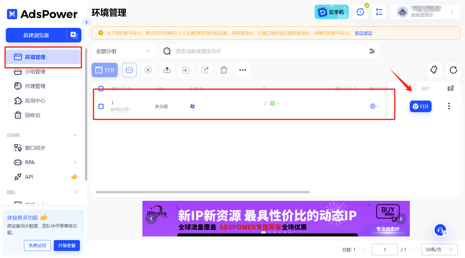 9、在环境管理可找到保存的浏览器,点击打开即可使用。