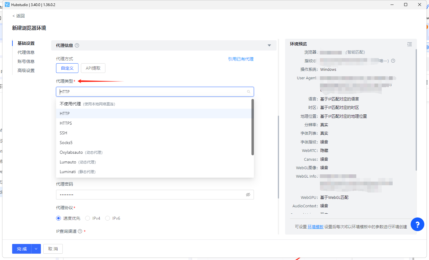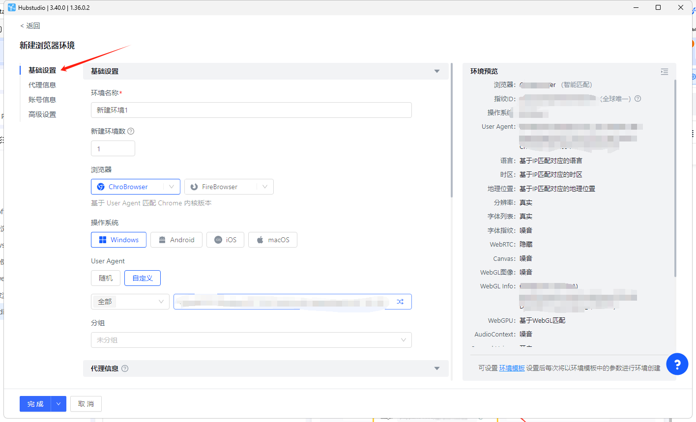 2、在基础设置中进行浏览器的基础设置,可按需选择以下内容,也可直接保持默认选项(Hubstudio已根据当前环境进行最佳配置设置)。