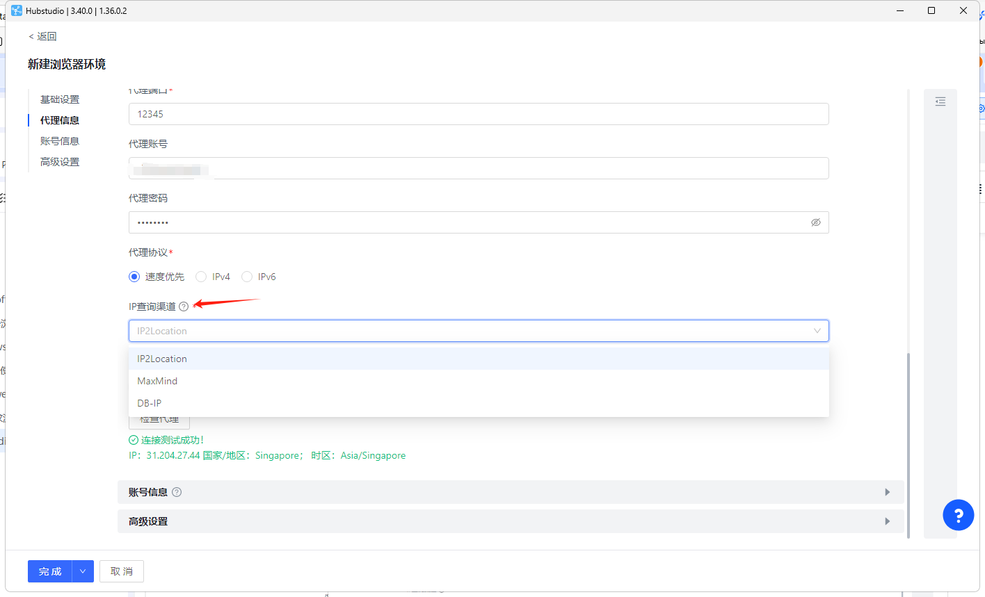 6、按需选择IP查询渠道(图示选择IP2Location作为IP查询渠道),IP查询渠道通常会查询IP是否正常以及IP状态是否健康等。