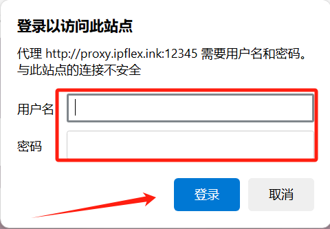 9、点击任意浏览器,将IPFlex代理IP username和password复制至弹窗的用户名和密码处,点击登录即可。