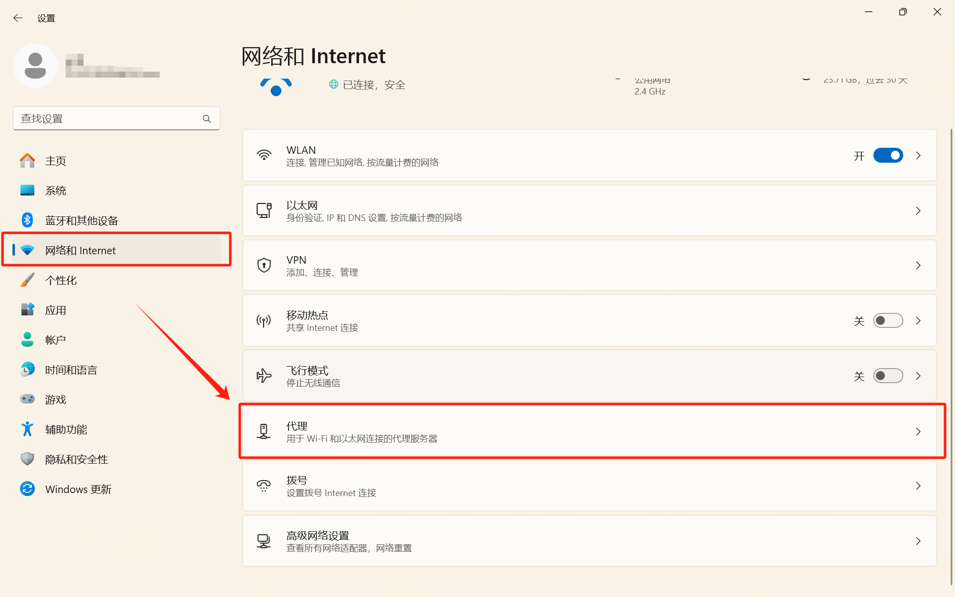 6、点击设置进入设置界面,选择网络和Internet-代理。