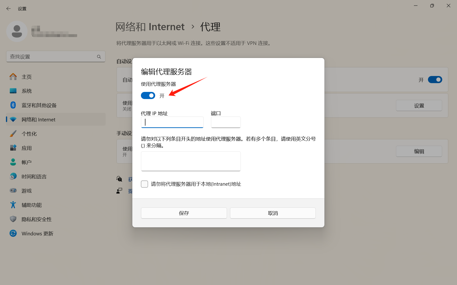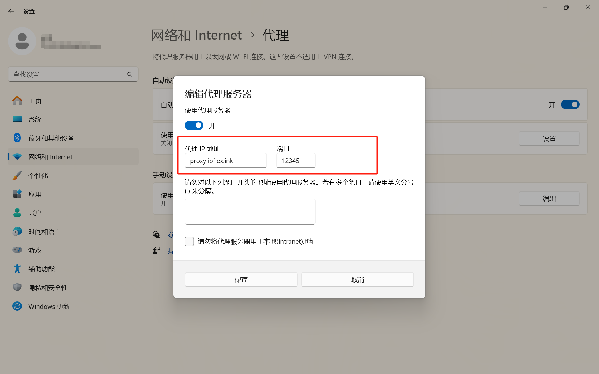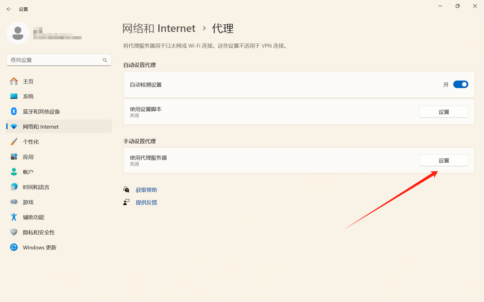 7、选择手动设置代理,点击设置,将使用代理服务器打开。
